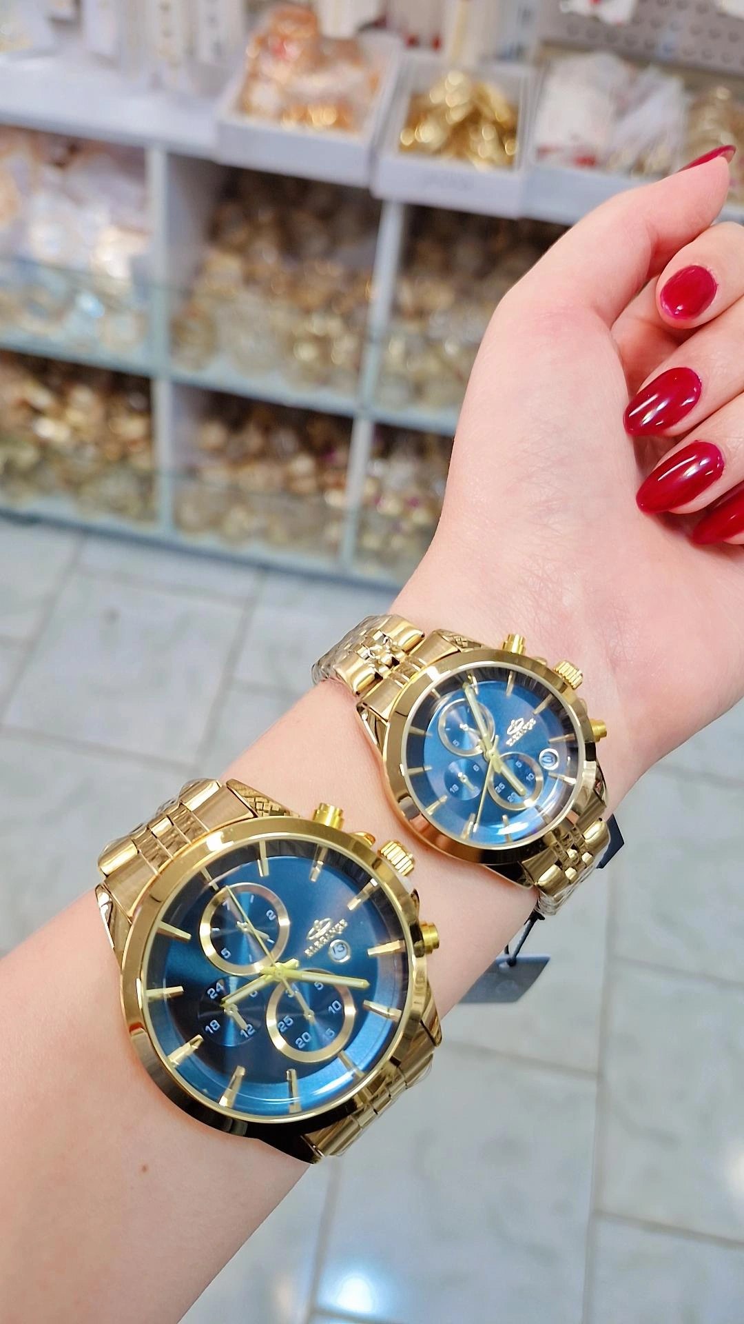 ست ساعت کاپلی طلایی صفحه آبی تقویمدار باکیفیت