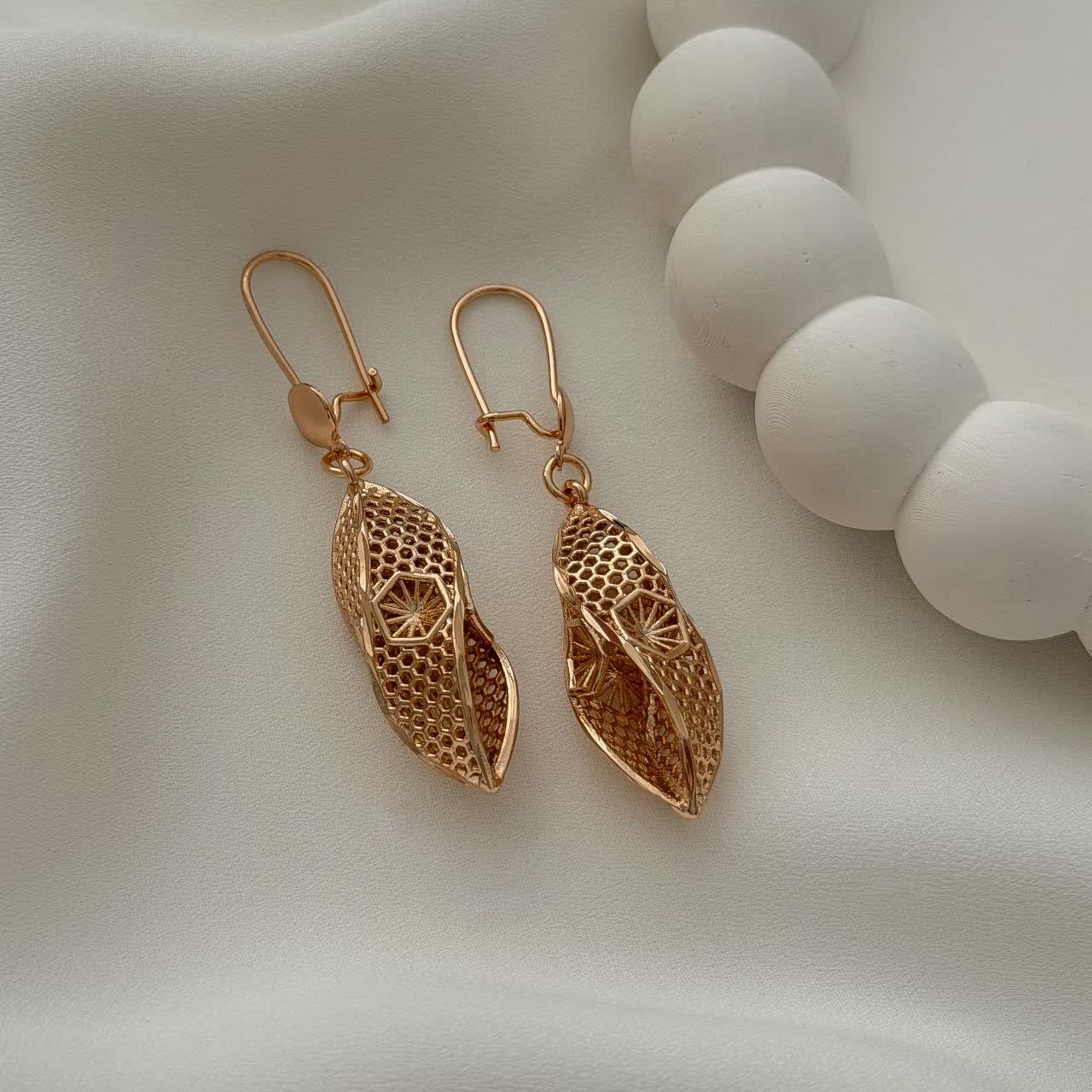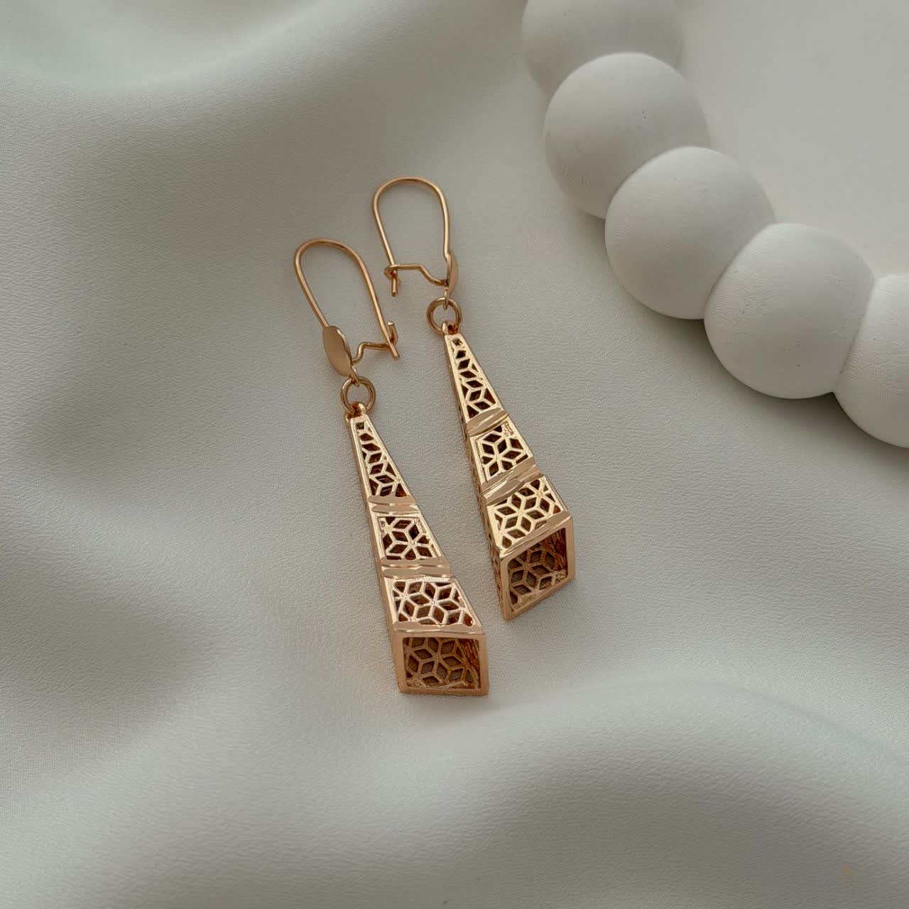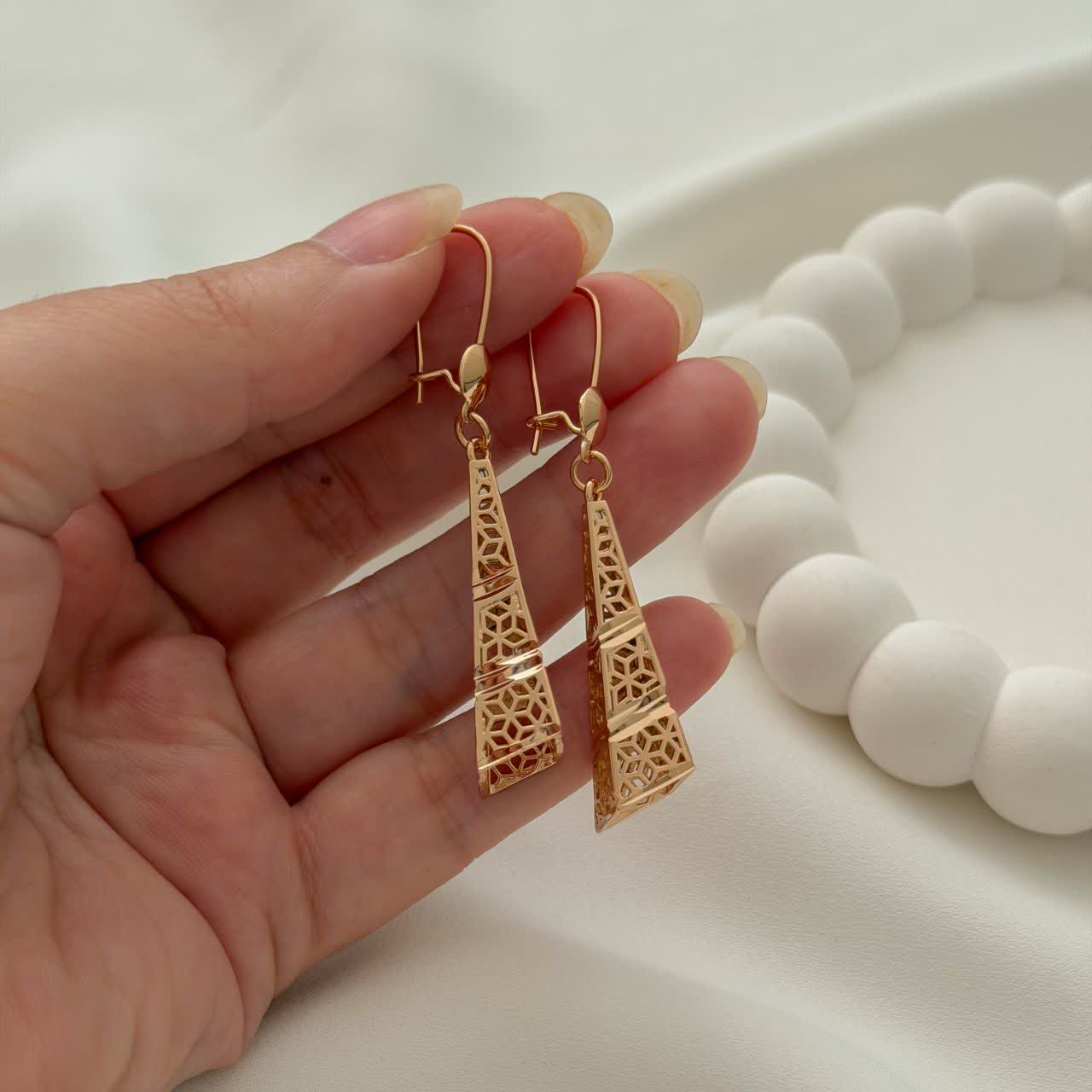 گوشواره آویز جدید طرح طلا ۳ بعدی برندژوپینگ ویژگی های محصول برند:ژوپینگ رنگ:طلایی با آبکاری طلا 18 عیار ارتفاع گوشواره:5 سانت