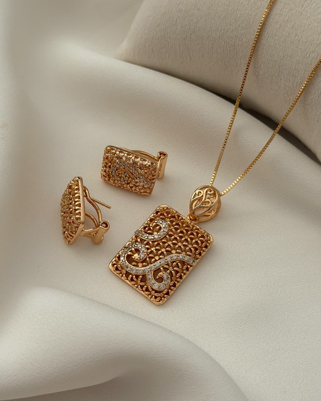 نیمست لوکس زنانه کپی طلا ژوپینگ کد 2526 ویژگی های محصول برند:ژوپینگ نگین مخراجکاری رنگ:طلایی با آبکاری طلا 18 ارتفاع پلاک:3.5 سانت ارتفاع گوشواره:1.7 سانت زنجیر:ندارد